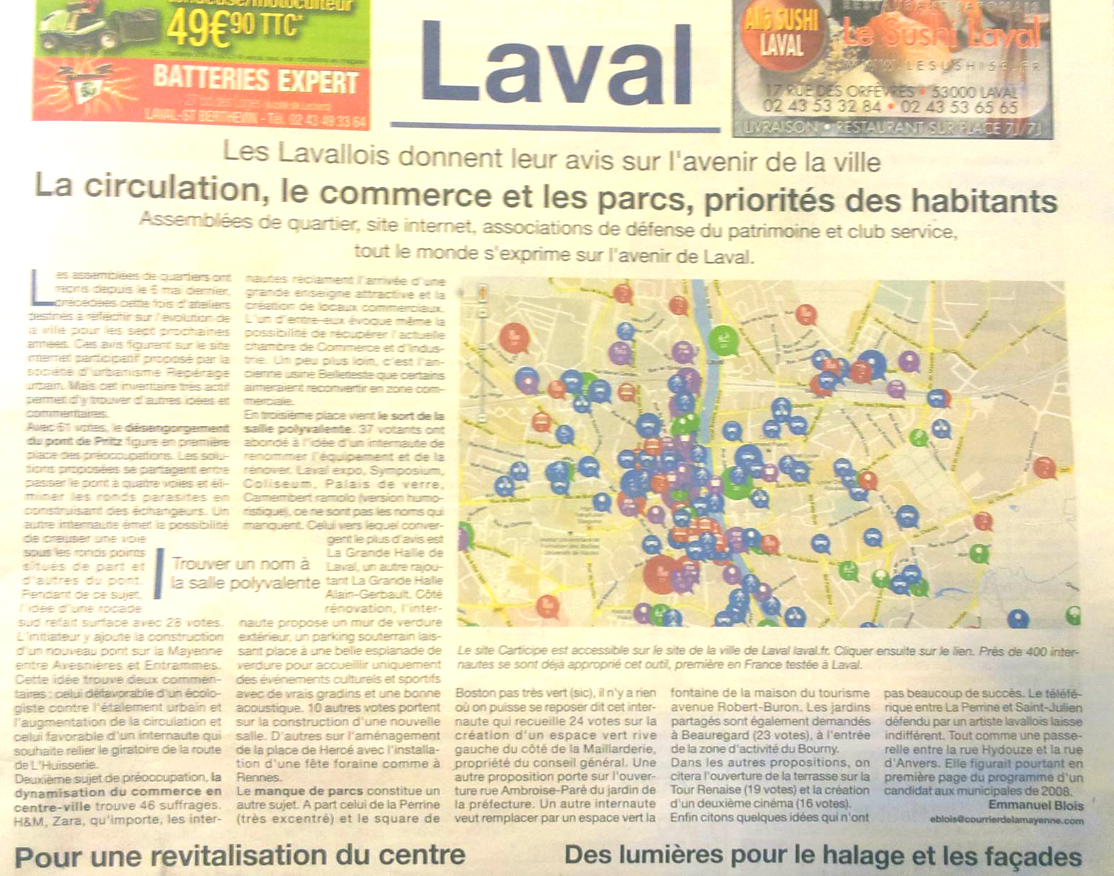 A Laval, nos communiqués de presse, appuyés par la ville, ont été relayés dans de nombreux articles et dans différents médias (presse écrite, radios locales). La ville a également relayé l’information à de multiples reprises dans son journal municipal, ainsi que sur son site Web. De plus, nous avons participé à une réunion publique de lancement, puis animé 7 réunions de quartiers, pour expliquer l’outil et faire « carticiper » les habitants en direct. Nous avons, enfin, tenu un stand pendant tout un week-end aux côtés de la Ville lors d’un salon grand public local (Laval Virtual). Avec 347 inscrits par Internet et 120 contributeurs directs recensés lors des « réunions de carticipation » animées par nos soins, nous avons atteint plus de 460 participants à la concertation lavalloise. Selon que l’on rapporte ce chiffre à la population de la ville (50 000) ou de l’agglomération (75 000), on atteint un niveau de participation de l’ordre d’un habitant sur 100 à 160. Ce qui représente un « taux de pénétration » 6 à 10 fois plus élevé qu’à Strasbourg ou Marseille. Le nombre de contributions et l’audience du site à Laval, sont proportionnellement du même niveau d’intensité : plus de 1 100 contributions écrites, plus de 11 000 pages vues en 7 mois…